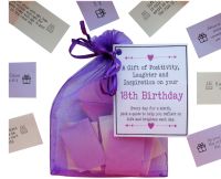 The organza bag measures 13 x 18cm and comes with a laminated label attached which reads "A Gift of Positivity, Laughter and Inspiration on your 18th Birthday" Every day for a month, pick a quote to help you reflect on life and brighten each day." The gift is then packaged in a cellophane bag.