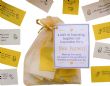 The organza bag measures 13 x 18cm and comes with a laminated label attached which reads "A Gift of Positivity, Laughter and Inspiration for a *********** ". Every day for a month, pick a quote to help you reflect on parenthood and brighten your day." The gift is then packaged in a cellophane bag.